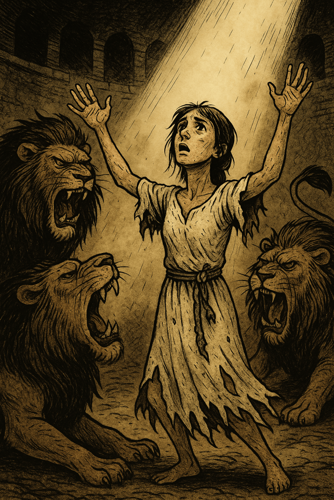 « Sainte Blandine, une jeune fille qu’on a jetée dans la fosse aux lions. »