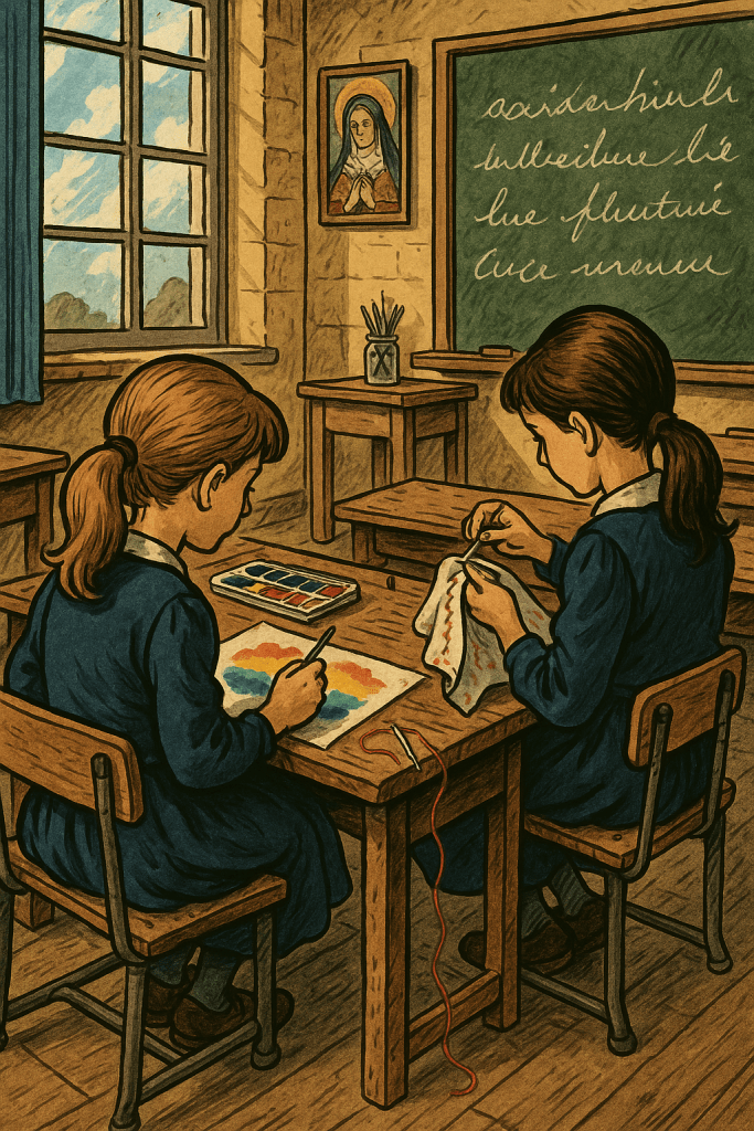 La mère prieure m’a fait visiter : des classes d’une dizaine d’élèves, des bureaux en bois à l’ancienne, avec les chaises fixées dessus (si t’es un vrai, t’as connu ça !), des tableaux de saints, une chapelle lumineuse. Ça sentait le sérieux et la paix.